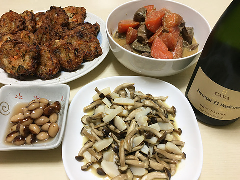 本日のメニューは、上段左から自家製さつま揚げ、鶏レバーとにんじんの酒粕みそ煮、下段左からトラ豆の煮豆、タイラ貝としめじのバターしょう油炒め、です。