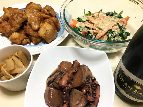 本日のメニューは、上段左から鶏のから揚げ、春菊とにんじんのごまドレッシングサラダ、下段左から中華風メンマ、イカと里芋の煮物、です。