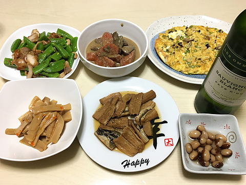 本日のメニューは、上段左から鶏から揚げとスナップエンドウのシーザードレッシング炒め、鶏レバーとにんじんの酒粕みそ煮、タイラ貝としめじと春菊のオムレツ、下段左からメンマのラー油和え、煮アナゴ、煮豆、です。