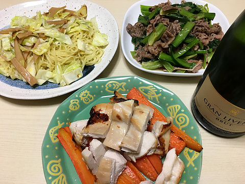 本日のメニューは、上段左からめんまの塩焼きそば、牛肉と小松菜のしょうが焼き、下段が鶏胸肉の塩麹漬け焼き、です。