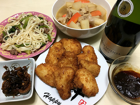 本日のメニューは、上段左から牛肉と小松菜の焼きうどん、鶏皮と大根とにんじんの梅煮、下段左から切り干し大根のハリハリ漬け、チキン味噌カツ(チキンは既製品を揚げたもの)、です。