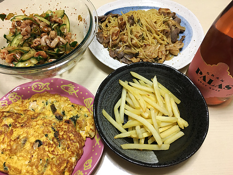 本日のメニューは、上段左からコブクロときゅうりのピリ辛和え、鶏皮と砂肝の塩焼きそば、下段左からグラタンオムレツ、ポテトフライ、です。