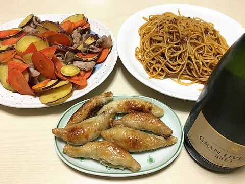 本日のメニューは、上段左から豚肉とにんじんとさつまいもの塩炒め、ボロネーゼパスタ、下段が焼き鶏皮餃子(既製品を焼いたもの)、です。