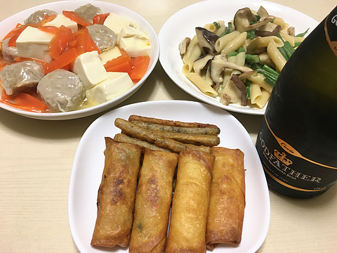 本日のメニューは、上段左からシュウマイと豆腐とにんじんの中華煮、椎茸とインゲンのカルボナーラペンネ、下段が春巻きとゴボウのから揚げ(既製品を揚げたもの)、です。