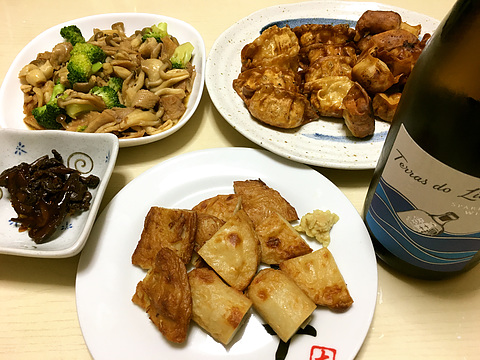 本日のメニューは、上段左から鶏皮としめじの照り焼き、揚げ餃子(既製品を揚げたもの)、下段左からうなぎの肝煮、焼きさつま揚げ、です。