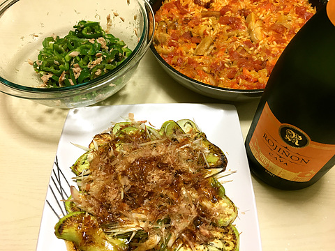 本日のメニューは、上段左からピーマンのツナ和え、パエリア、下段がフライパン焼きナスとミョウガのサラダ、です。
