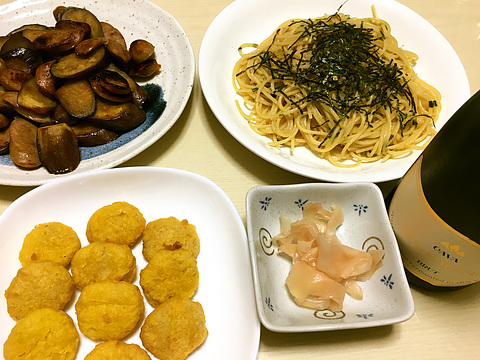 本日のメニューは、上段左からソーセージと長ナスの塩炒め、納豆パスタ、下段左からチキンナゲット(既製品)、自家製ガリ、です。