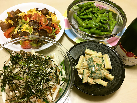 本日のメニューは、上段左からキクラゲとトマトの玉子炒め、枝豆、下段左から蕎麦のネバネバ和え、きゅうりのみそマヨネーズ、です。