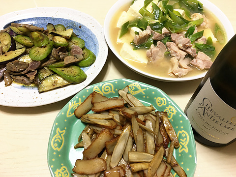 本日のメニューは、上段左から砂肝のコンフィとナスのソテー、鶏肉と豆腐とネギの塩煮込み、下段がさつま揚げとゴボウのバターきんぴら、です。