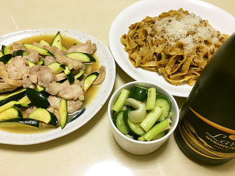 本日のメニューは、上段左から鶏肉とズッキーニの塩炒め、ボロネーゼパスタ、下段がきゅうりとセロリの浅漬け、です。