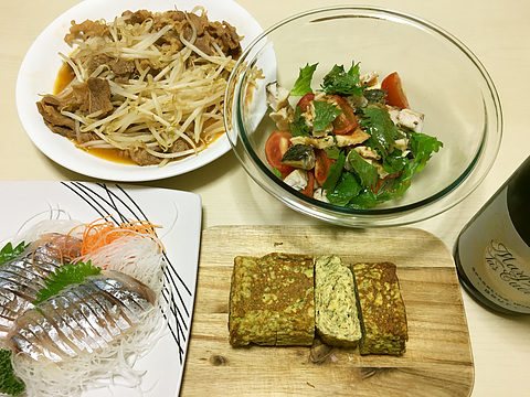 本日のメニューは、上段左から牛カルビのもやし炒め、塩サバとトマトのサラダ、下段左からアジの刺身、あおさ入りだし巻き玉子、です。