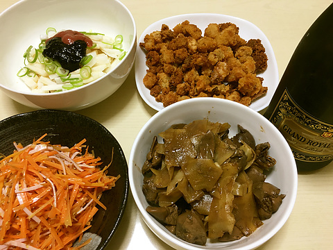 本日のメニューは、上段左から長芋の海苔梅和え、鶏皮のから揚げとモツのから揚げ(既製品を揚げたもの)、下段左からハムとにんじんの粒マスタードマリネ、鶏レバーと新生姜のウスターソース煮、です。