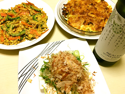 本日のメニューは、上段左から海苔風味のゴーヤチャンプルー、じゃがいもとズッキーニのチーズ焼き、下段が薬味たっぷり冷ややっこ、です。