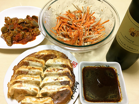 本日のメニューは、上段左から砂肝のコンフィのトマトソテー、鶏手羽元とにんじんとゴボウの胡麻ドレッシングサラダ、下段が焼き餃子(有名餃子店のもの)、です。