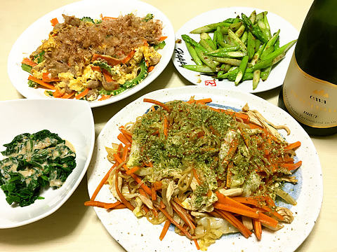本日のメニューは、上段左からゴーヤチャンプルー、アスパラのバター炒め、下段左からツルムラサキの胡麻ドレッシング和え、にんじんと鶏胸肉の焼きそば、です。
