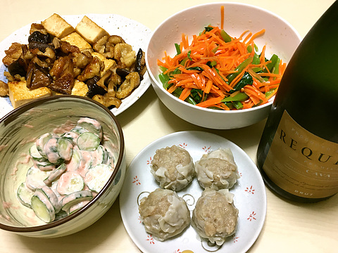 本日のメニューは、上段左から鶏皮と豆腐と椎茸の照り焼き、ツルムラサキとにんじんのナムル、下段左からきゅうりの梅マヨ和え、シュウマイ(既製品を蒸したもの)、です。