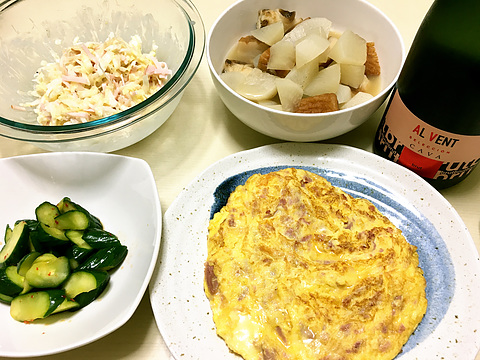 本日のメニューは、上段左からコールスローサラダ、洋風おでん、下段左からきゅうりのキムチ漬け、生ハムとチーズのオムレツ、です。