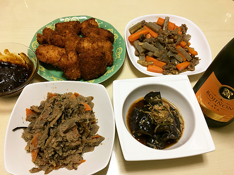 本日のメニューは、上段左から味噌チキンカツ、牛肉とゴボウとにんじんの甘酢炒め、下段左から卯の花、ナスの南蛮漬け、です。