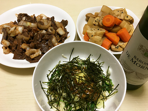 本日のメニューは、上段左から牛ハラミ焼き、がんもどきと根菜の煮物、下段がオクラと薬味野菜のなめ茸和え、です。