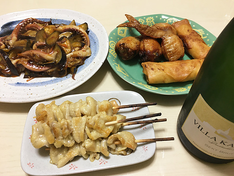 本日のメニューは、上段左からイカとナスの麻婆炒め、手羽先餃子と春巻き(既製品を揚げたもの、下段が鶏皮焼き鳥、です。