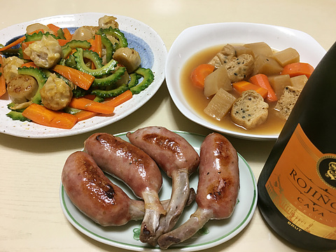 本日のメニューは、上段左からシュウマイとゴーヤとにんじんのバター醤油炒め、がんもどきと大根とにんじんの梅煮、下段が骨付きソーセージ、です。