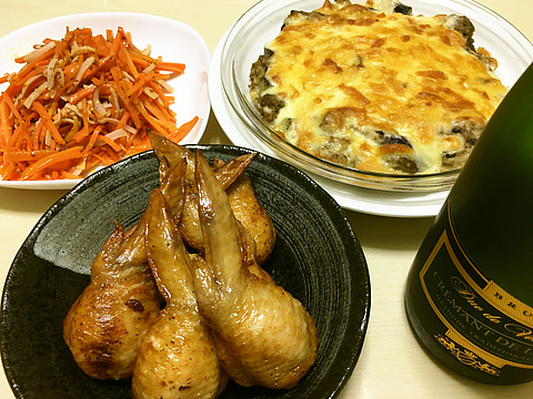 本日のメニューは、上段左からハムとにんじんの粒マスタード炒め、つくねとナスのグラタン、下段が手羽先餃子(既製品を揚げたもの)、です。