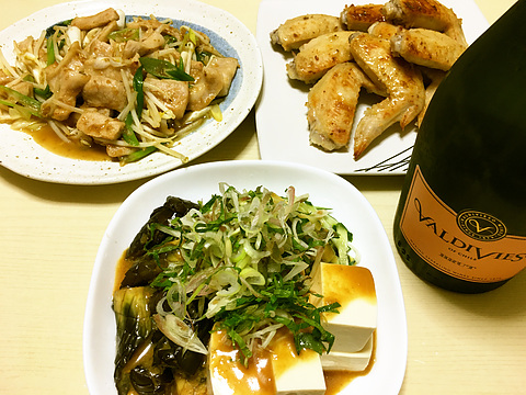 本日のメニューは、上段左から豚トロともやしのおろしダレ炒め、手羽先の塩柚子焼き、下段がやっこと揚げナスの胡麻ダレがけ、です。