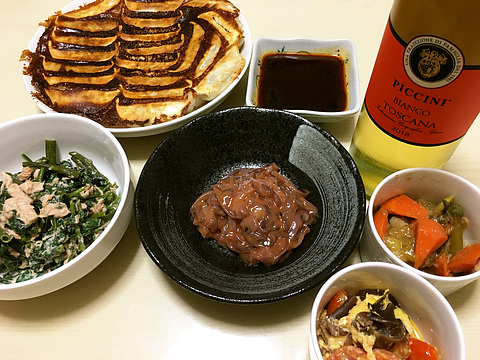 本日のメニューは、上段が焼き餃子(冷凍品を焼いたもの)、下段左から空芯菜のツナ和え、イカの塩辛、残りもの2種(トマトとキクラゲの玉子炒め&にんじんと鶏レバーの生姜おろし焼き)、です。
