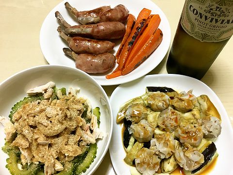鶏胸肉とゴーヤのしょう油ドレッシングサラダ、他 本日のメニューは、上段が骨付きソーセージとにんじんのソテー、下段左から鶏胸肉とゴーヤのしょう油ドレッシングサラダ、シュウマイと蒸しナスの胡麻ダレ和え、です。