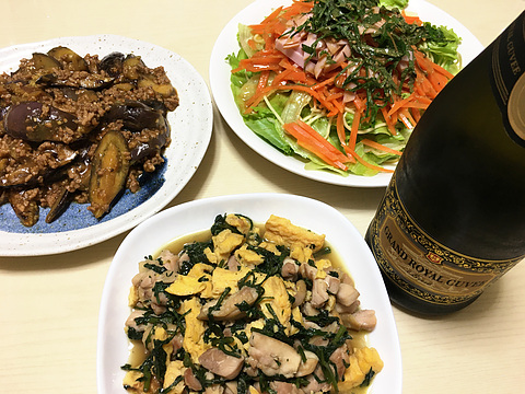 本日のメニューは、上段左から麻婆茄子、ラーメンサラダ、下段が鶏肉と春菊の玉子炒め、です。
