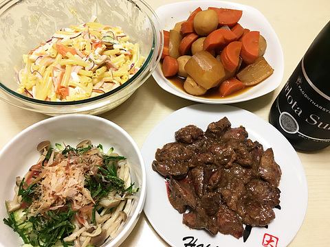 鶏レバーの生姜ゴマみそ炒め、他 本日のメニューは、上段左からマカロニサラダ、根菜の煮物、下段左からしめじときゅうりの梅和え、鶏レバーの生姜ゴマみそ炒め、です。 鶏レバーはパサパサにはなっておらず、柔らかくておいしかったです