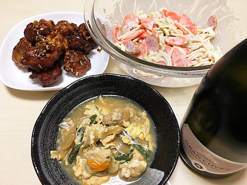 本日のメニューは、上段左から鶏から揚げのテンメンジャン和え、パスタサラダ、下段がガンモとインゲンの玉子とじ、です。