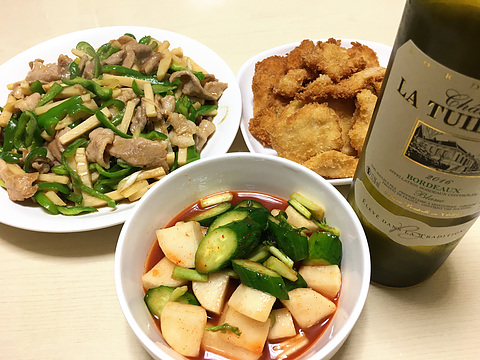 本日のメニューは、上段左からチンジャオロースー、自家製チキンカツ、下段がきゅうりと大根のキムチ漬け、です。