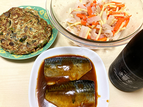 本日のメニューは、上段左からナスのごま味噌のオムレツ、マカロニとにんじんと大根のツナサラダ、下段がさばみそ煮(既成品)、です。