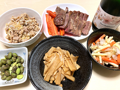 本日のメニューは、上段左から酢モツ、ハラミの塩麹漬け焼き、下段左から枝豆の浸し豆、自家製めんま、マカロニとにんじんと大根のツナ和え、です。