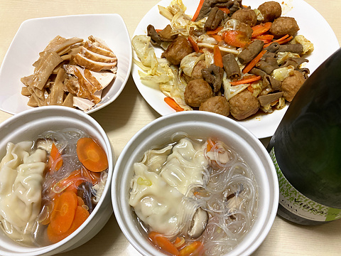 本日のメニューは、上段左から自家製めんまとスモークチキン、モツ肉団子野菜炒め、下段が餃子と春雨のスープ、です。