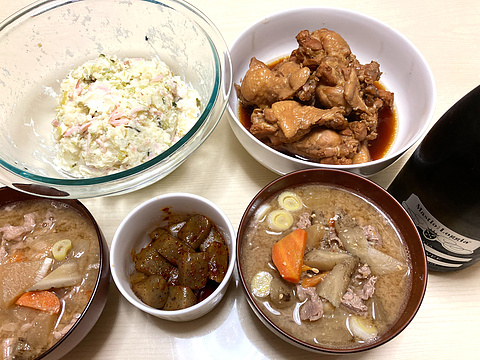 本日のメニューは、上段左から大根葉入りポテトサラダ、鶏手羽元の黒酢煮、下段左から牛汁、雷こんにゃく、です。