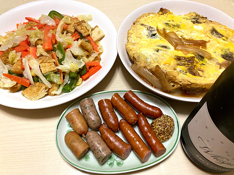 本日のメニューは、上段左から厚揚げ入り野菜炒め、ナス天と芋天の玉子とじ、下段がソーセージ盛り合わせ、です。