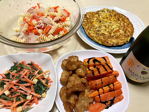 本日のメニューは、上段左からフィジッリとにんじんと大根のツナ和え、にんじんとさつまいものクリームチーズオムレツ、下段左からにんじんと春菊の胡麻シーザーサラダ、鶏のから揚げと焼きにんじん&バルサミコ酢がけ、です。