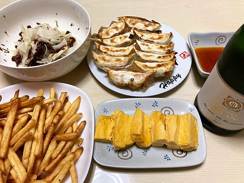 本日のメニューは、上段左からカブのハリハリ漬け、餃子専門店 (香蘭)の焼き餃子、下段左からフライドポテト、市販の玉子焼き、です。