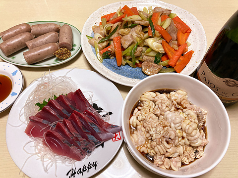 本日のメニューは、上段左からソーセージ、豚トロと野菜の塩炒め、下段左からハマチの刺身、白子ポン酢、です。