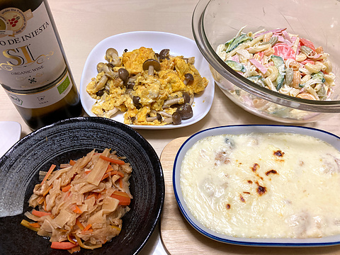 本日のメニューは、上段左からしめじの玉子炒め、マカロニサラダ、下段左からかんぴょうと切り干し大根の煮物、白子グラタン、です。