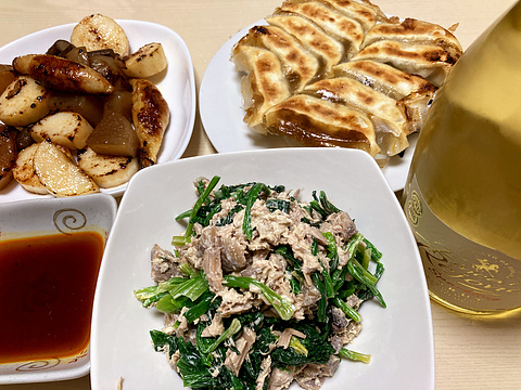 本日のメニューは、上段左から根菜のバター醤油ソテー、焼き餃子(既成品を焼いたもの)、下段がほうれん草のツナ和え、です。