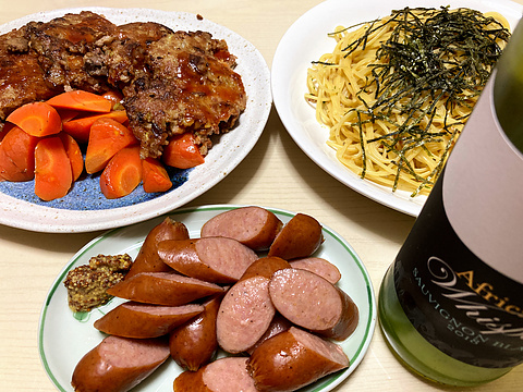 本日のメニューは、上段左からレバー入りビッグハンバーグ、和風カルボナーラパスタ、下段がガーリックソーセージ、です。