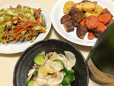 本日のメニューは、上段左からソース焼きそば、ハンバーグとにんじんとジャガイモのバターソテー、下段がマグロと浅漬けのサラダ、です。