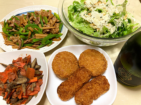 本日のメニューは、上段左からチンジャオロースー、シーザーサラダ、下段左から牛肉とにんじんの時雨煮、メンチカツとイカフライ(既製品を揚げたもの)、です。
