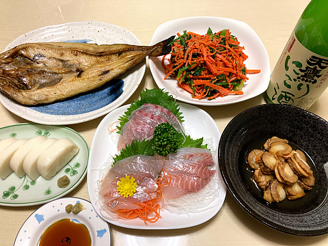 本日のメニューは、上段左から真ホッケの干物、ほうれん草とにんじんのピーナッツ和え、下段左から板わさ、白身の刺身、ホタテの煮付け、です。