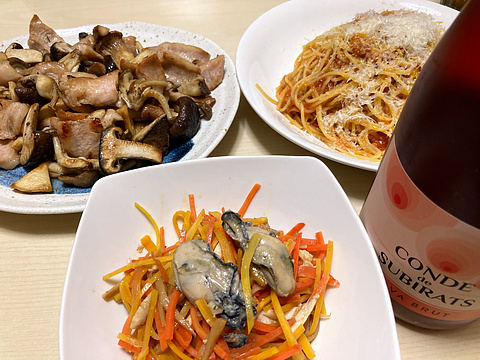 本日のメニューは、上段左から豚トロときのこの塩炒め、自家製トマトソースパスタ、下段が牡蠣とにんじんのポン酢炒め、です。
