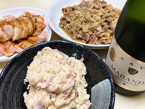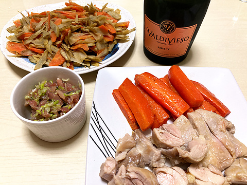 本日のメニューは、上段左から低温調理蒸し鶏、牛肉とかんぴょうの時雨煮、下段が塩辛とクリームチーズのポテトサラダ、です。