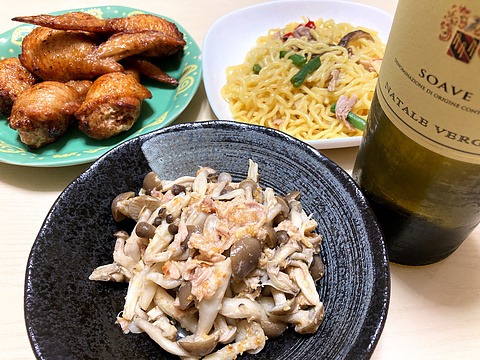本日のメニューは、上段左から手羽先餃子(既製品を揚げたもの)、塩焼きそば、下段がきのこのツナ和え、です。